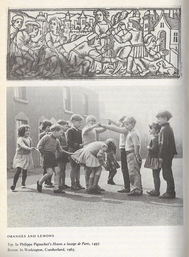 The game is played by two children forming an arch with their arms and the other children passing under in turn. When they reach the “chopper” line the arch children bring their arms down around the child passing under, who is now beheaded. “That chopping bit, it’s not really true because we only come down over their heads. They should be laying down so we could go Whack!” one seven year old concerned with authenticity confessed to the Opies. Their research reveals that the earliest text of the song from 1744 does not include the head chopping lines, while the earliest description of the game that does dates to 1853. That it is considerably older, or descends from an older game, is suggested by much evidence including the 1497 illustration that the Opies compare with a 1965 photo. But they find nothing to support a popular belief that it commemorates bells tolling the death knell as a criminal is led to his execution by torch-bearing guards.