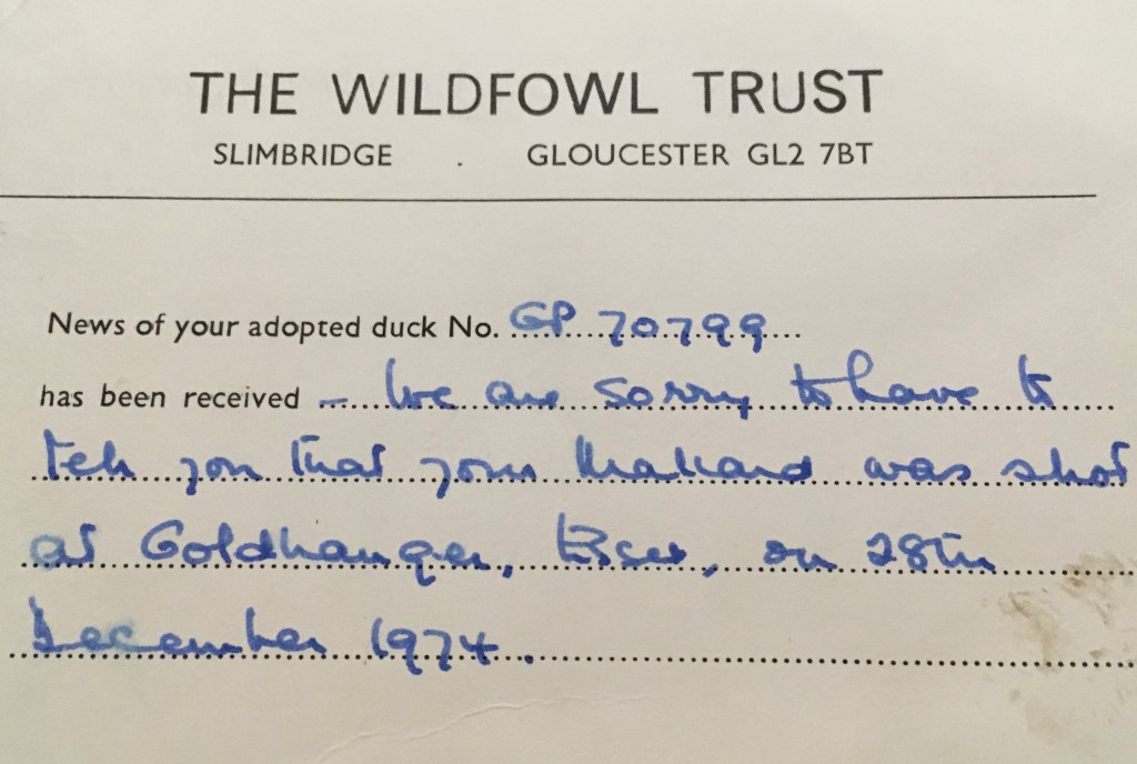 We are sorry to have to tell you that your mallard was shot at Goldhanger, Essex, on 28th December 1974.