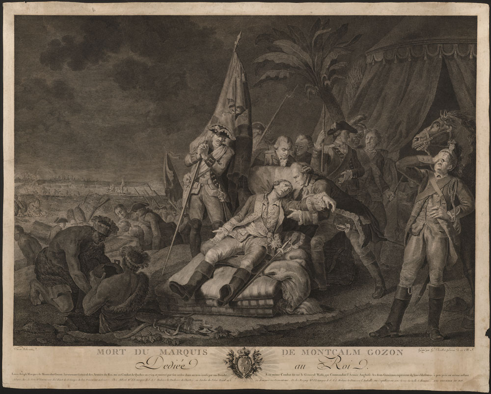 The defeated Montcalm would die of wounds the next day and his death would also be immortalized in a reverential artwork. Unlike Wolfe, who lies on the ground, Montcalm is shown lying on a comfy mattress.