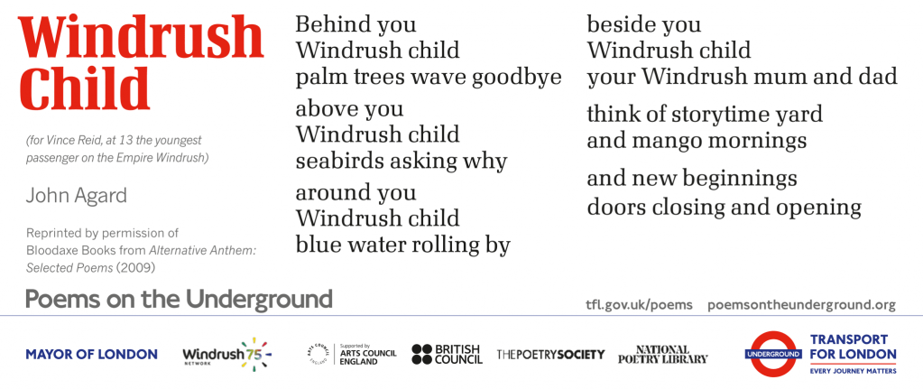 As for the book I thought I had purchased, the original Poems on the Underground was a best seller and several newer editions are available. There is now a website supported by grants from London Underground, Arts Council England, and the British Council. You can browse an archive of favorite poems by year as well as view the current choices, which are selected three times a year. The program highlights classical, contemporary, and international work, by both famous and relatively unknown poets. The first group of poems in 1986 included classics by Percy Bysshe Shelley and Robert Burns and contemporary poems by Seamus Heaney and Grace Nichols. The selections often follow a theme such as poems on love, music, science, nature, or a particular culture. Poems about London and the River Thames have been featured, and this June the 75th anniversary of the Windrush was celebrated with poems by writers of Caribbean descent.
