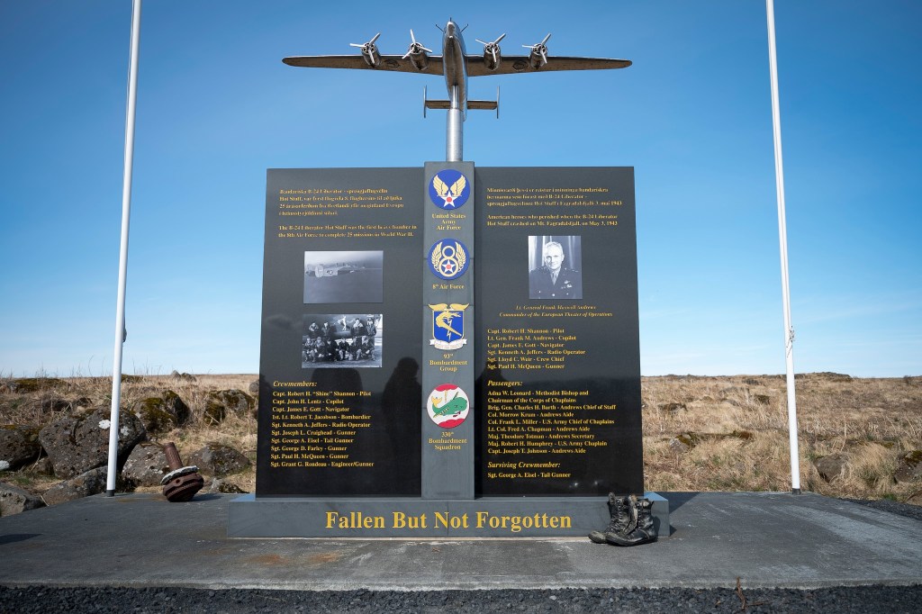 So I’ll end with this: General Andrews may be forgotten in America, a mere footnote in history, but he is remembered with reverence in Iceland. As recently as 2013, on the 70th anniversary of the crash, a memorial plaque was unveiled near Mt. Fagradalsfjall on the site where a monument is planned. The unveiling was accompanied by a flyby in missing man formation. Olafur Grimsom, the President of Iceland, spoke at a memorial service in nearby Keflavik attended by U.S. Ambassador Luis Arreaga, the Bishop of Iceland for Skalholt, and the Catholic Bishop of Reykjavik. The permanent memorial monument is scheduled to be unveiled on the 75th anniversary of the crash in 2018. It will point to the sky and the mountain where intrepid hikers still come upon pieces of twisted metal wreckage from Hot Stuff.